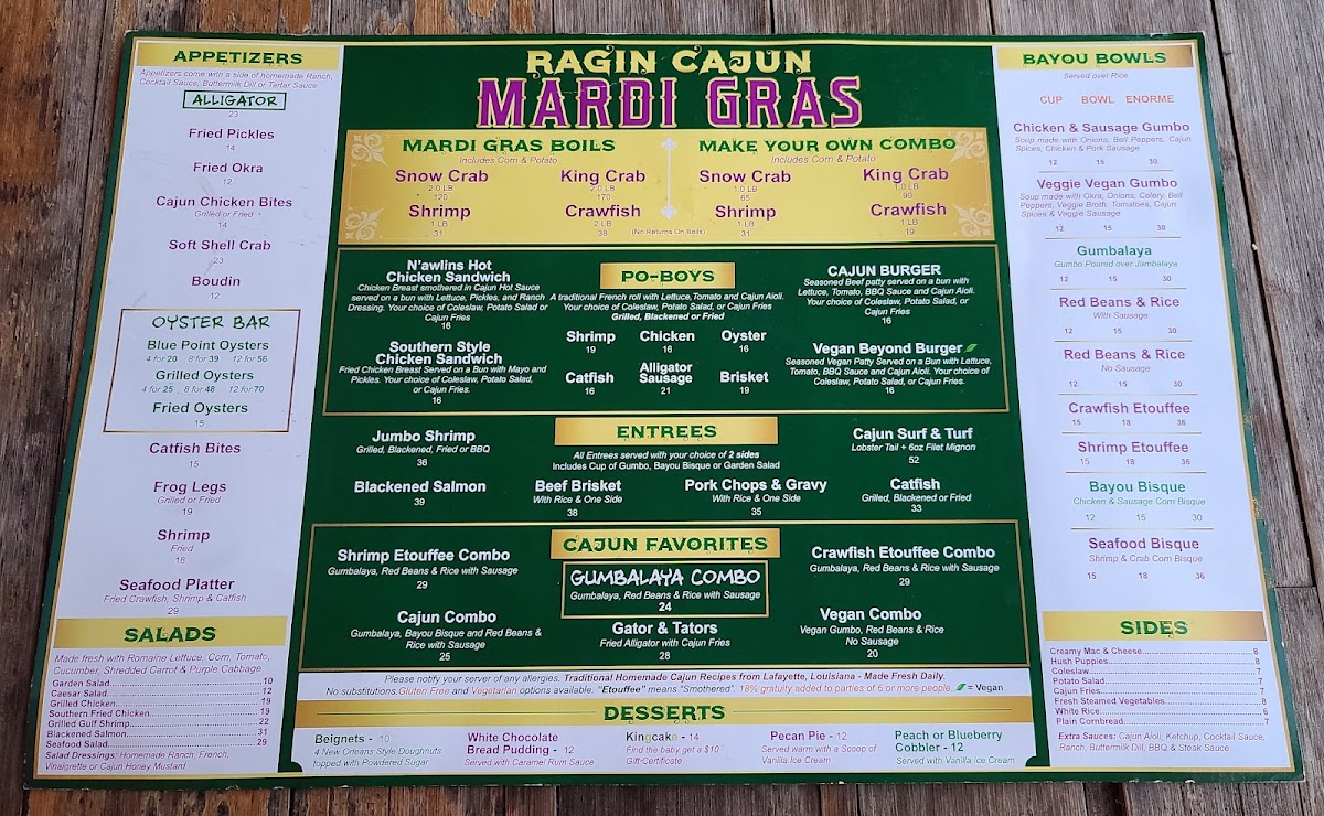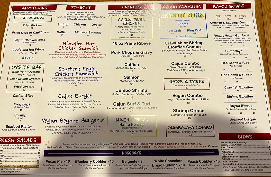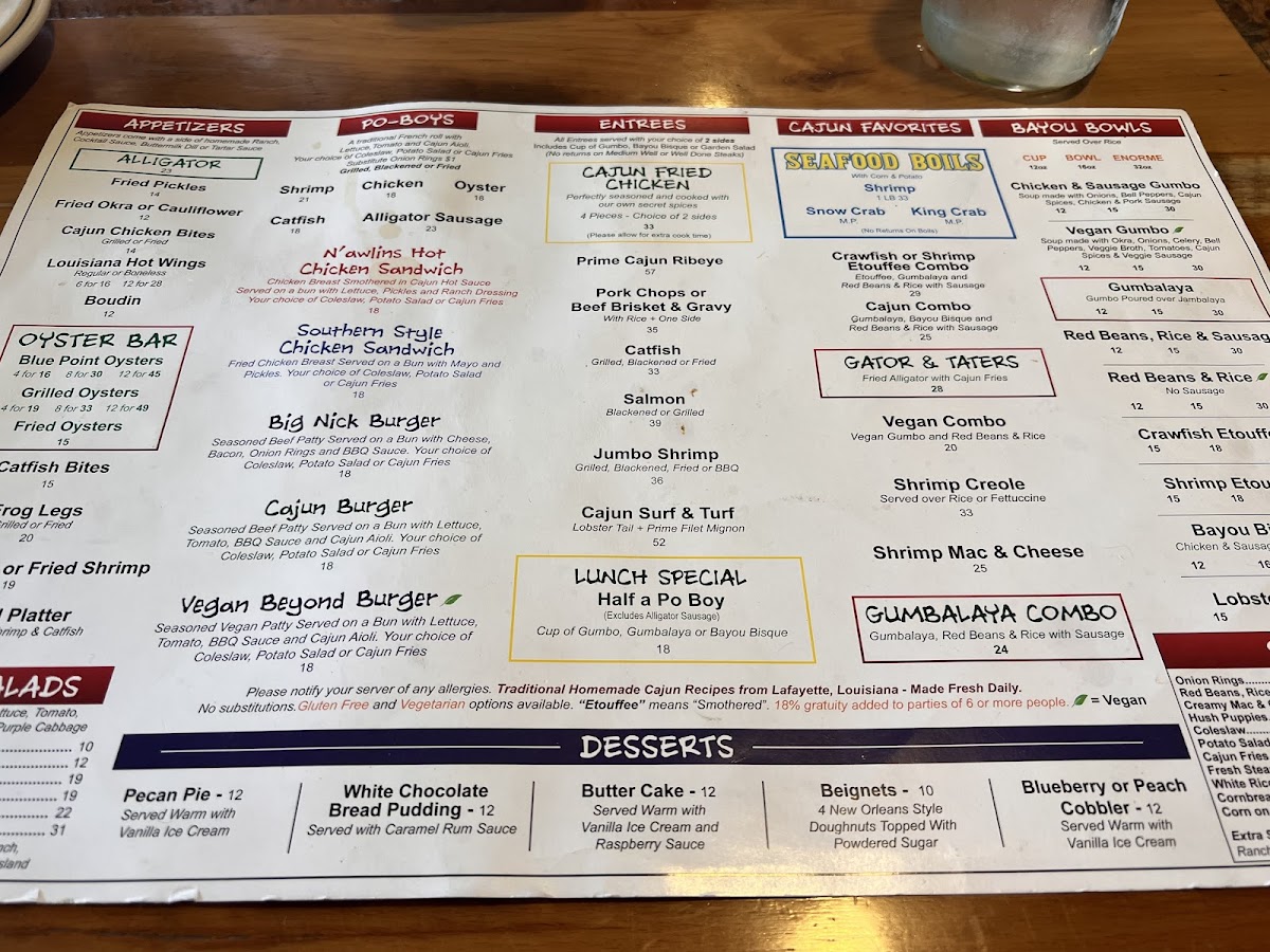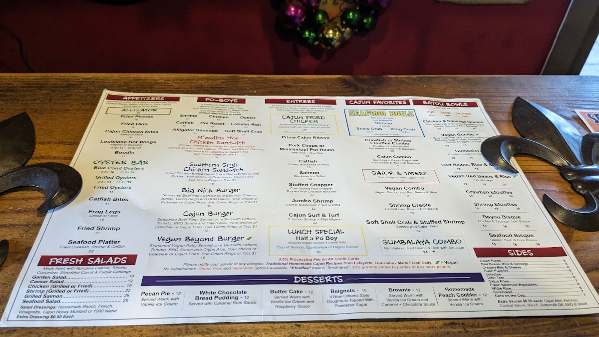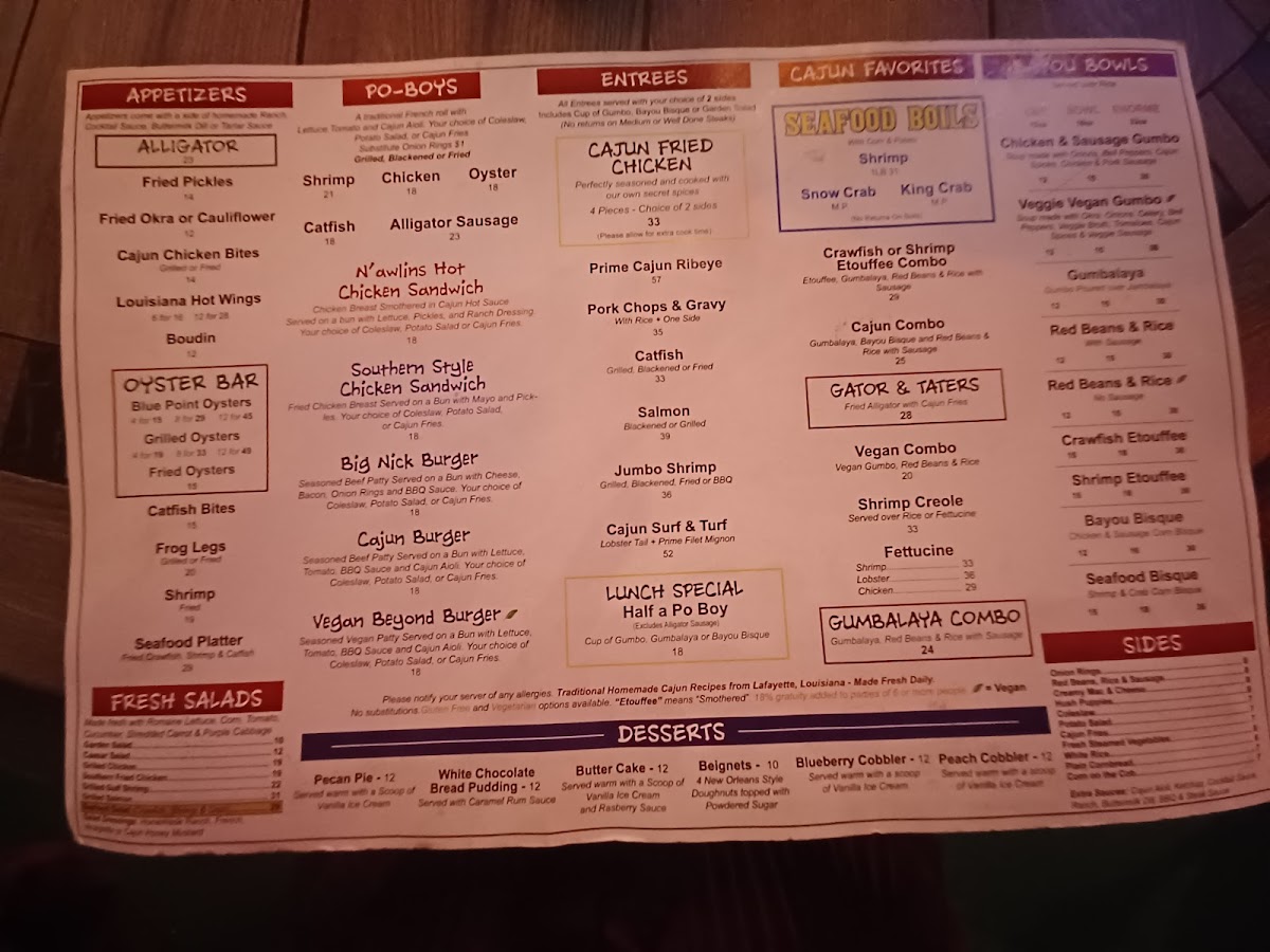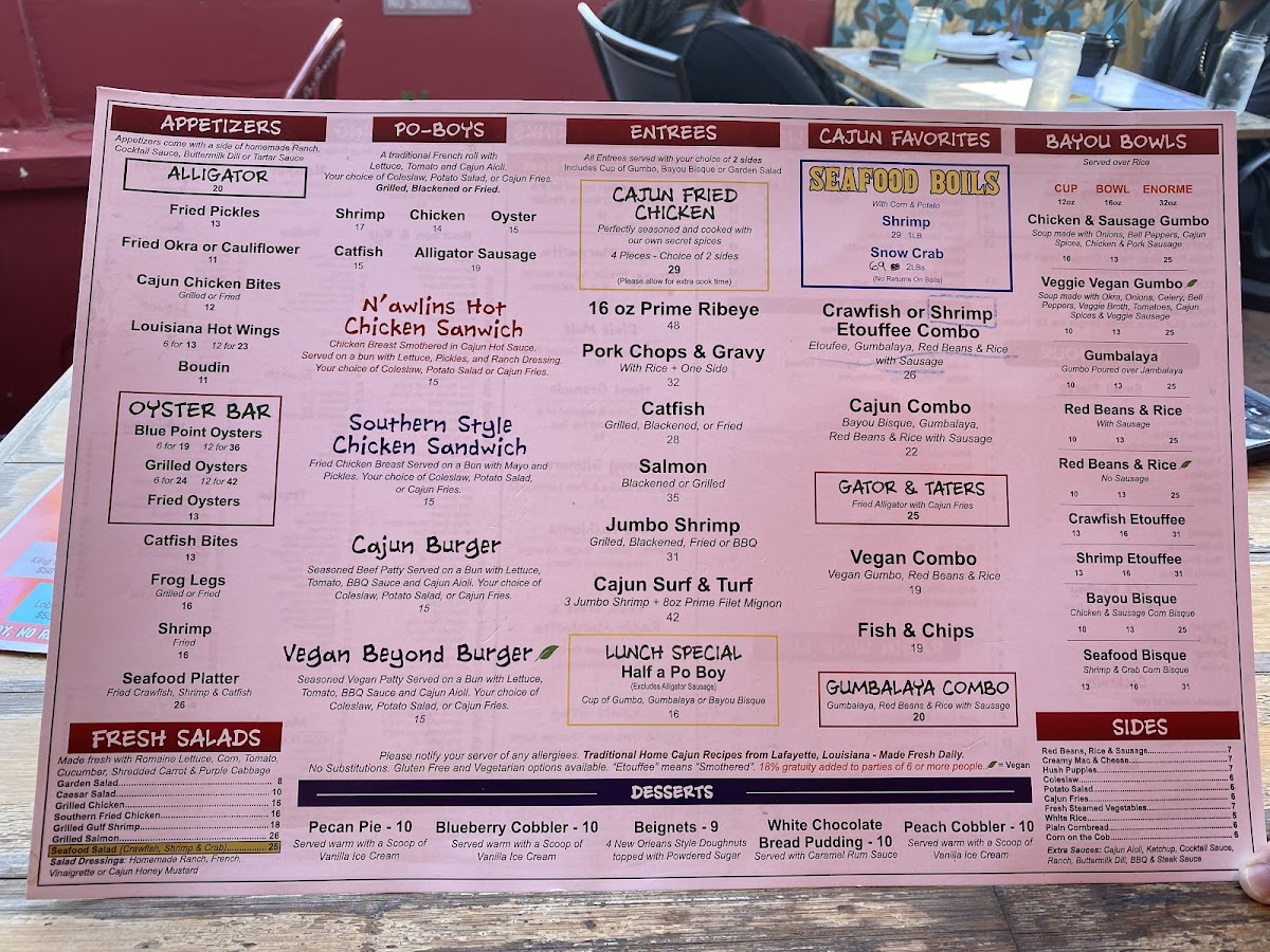 The menu is a testament to Cajun culture, featuring must-try items like the Catfish PoBoy and the N'awlins Hot Chicken Sandwich, both bursting with rich flavors. For a perfect start, indulge in their Seafood Platter, a delicious combination of fried crawfish, shrimp, and catfish.